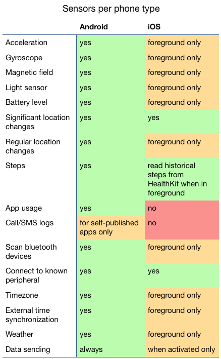 Separate Android and iOS versions of the Passive Data Collection app have been developed as part of RADAR-base, however, there are substantial differences in the mobile sensors available on iOS, in particular, these may be more sparse in iOS due to lack of background collection capabilities: